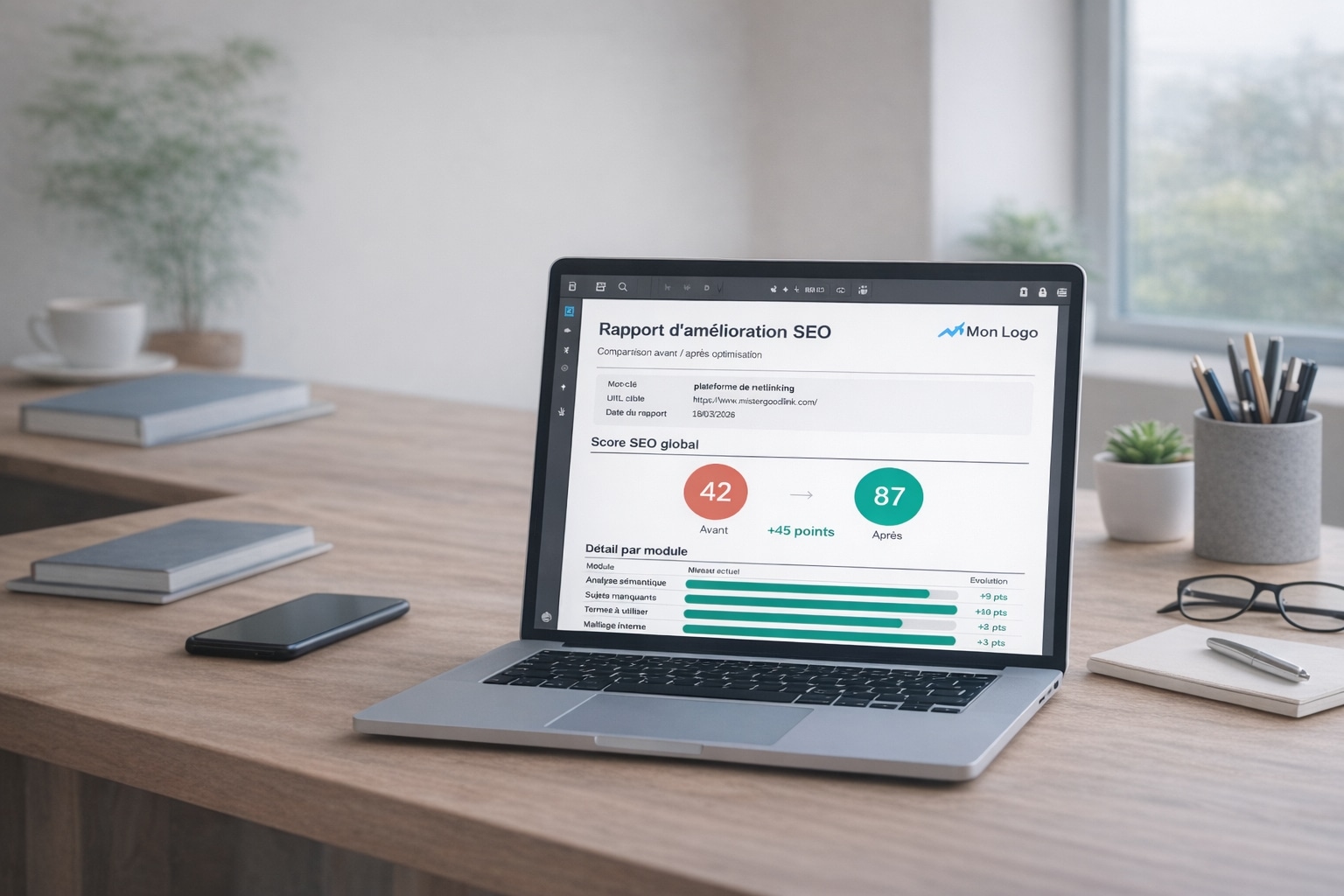 Vous cherchez un outil d'audit SEO qui va au-delà des recommandations génériques ? Horusium analyse votre page face au top 10 Google sur votre mot-clé et produit un score objectif sur 100 basé sur 9 modules : analyse sémantique, sujets manquants, termes à utiliser, maillage interne, netlinking, structure, titre & meta, mots-clés exacts et vitesse. Chaque module compare vos métriques à celles des pages qui performent réellement. Vous savez exactement quoi améliorer et dans quel ordre. Le tout avec un rapport PDF avant/après à remettre à vos clients. Premier audit offert, crédits sans abonnement ni expiration.