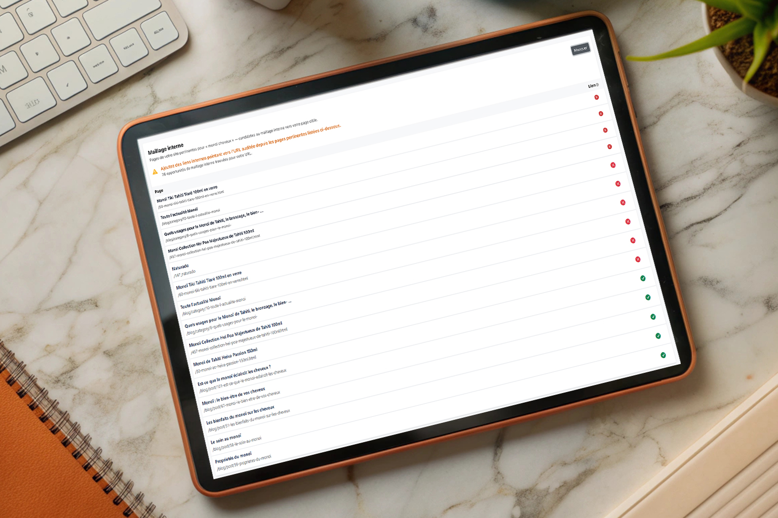 Horusium recherche les pages de votre propre site qui sont pertinentes pour votre mot-clé. Pour chaque page, il vérifie si un lien existe déjà et suggère une ancre optimisée basée sur l'analyse sémantique.