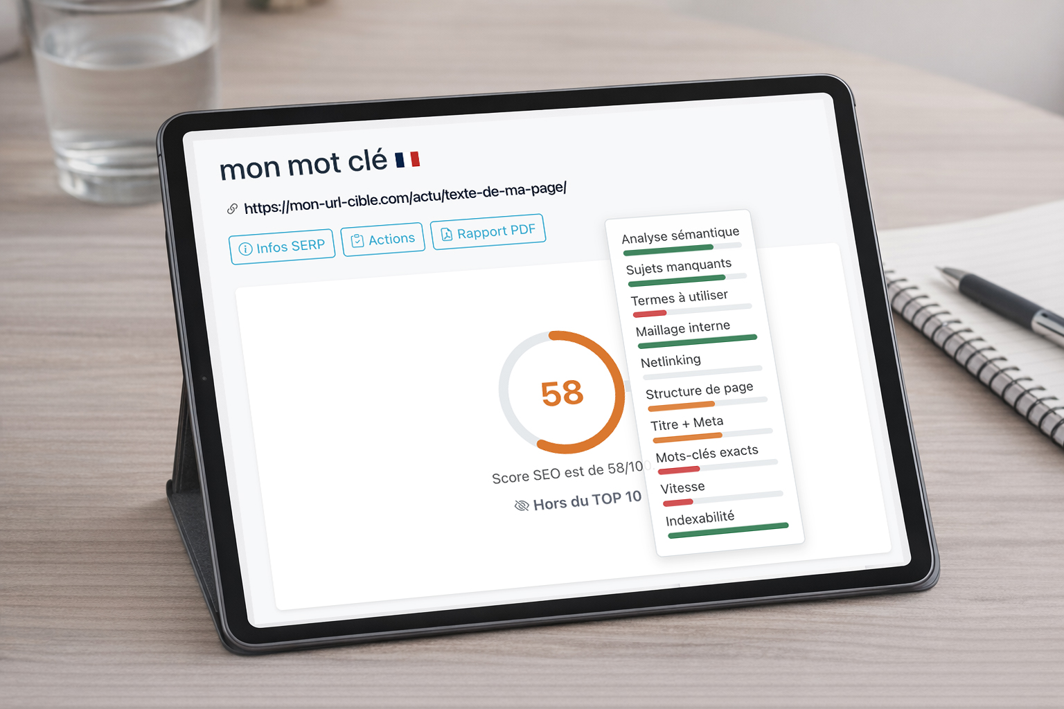 Un diagnostic complet de votre page, comparée objectivement aux 10 premiers résultats Google.