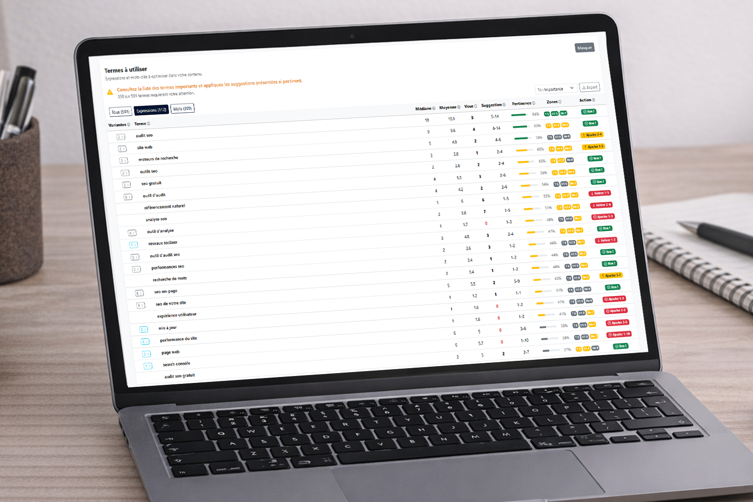 Un tableau comparatif affiche les mots et expressions clés utilisés par le top 10 ainsi que leur présence dans votre contenu. Pour chaque terme, un objectif à atteindre est indiqué. Vous savez exactement quoi ajouter, renforcer ou réduire.