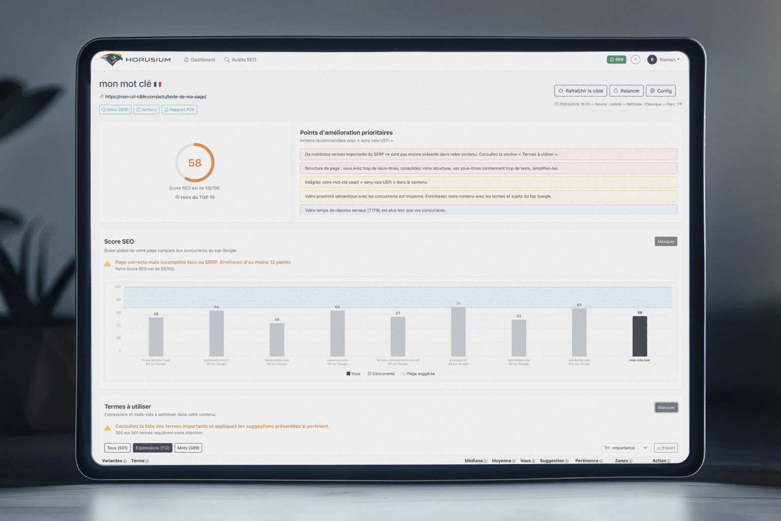 Optimisez votre page, puis mesurez vos progrès directement dans Horusium.