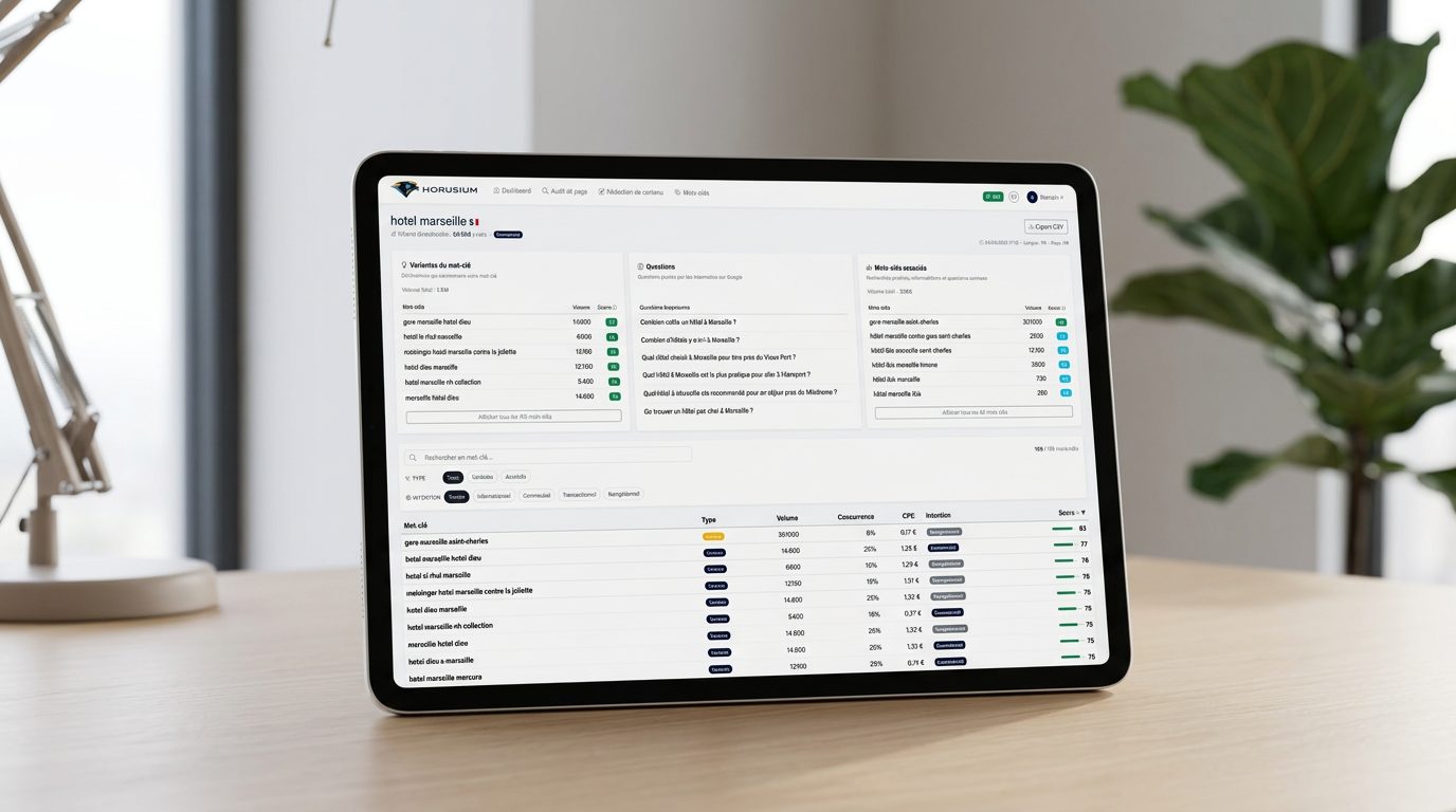 À partir d'un seul mot-clé, Horusium vous propose jusqu'à 200 suggestions sémantiquement proches, enrichies du volume mensuel, de la concurrence, du CPC et de l'intention de recherche. Le tout résumé par un score Horusium /100 pour aller à l'essentiel.